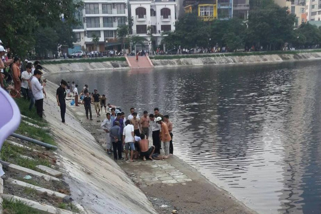 Hiện trường vụ nam thanh niên chết đuối khi tắm hồ Ngọc Khánh. Ảnh: P.Tuyến